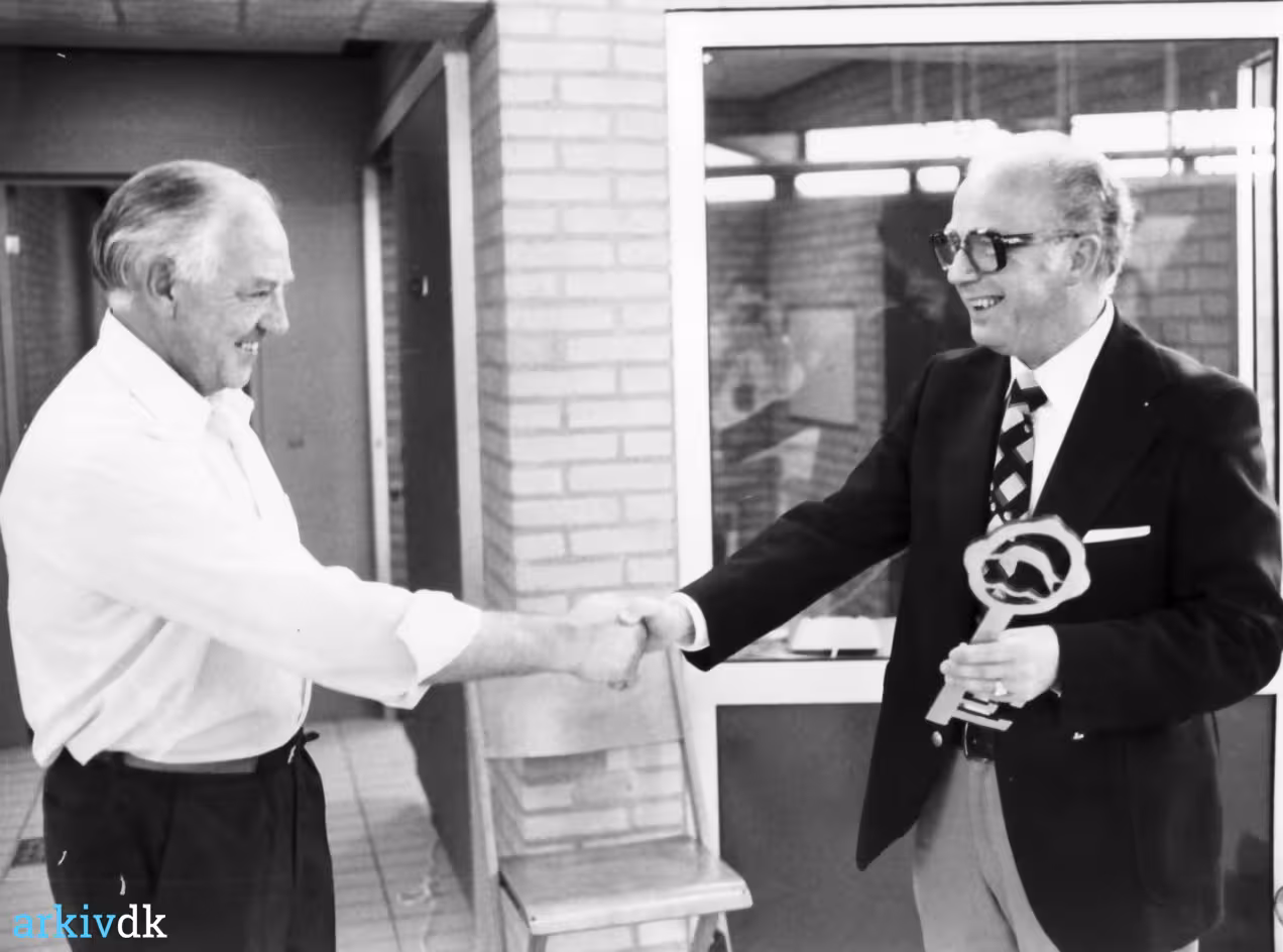 Svømmehaludvalgets formand (til venstre) Poul Hoffmann overrækker borgmester Ib Nordahl Pedersen svømmehallens hovednøgle ved indvielsen af