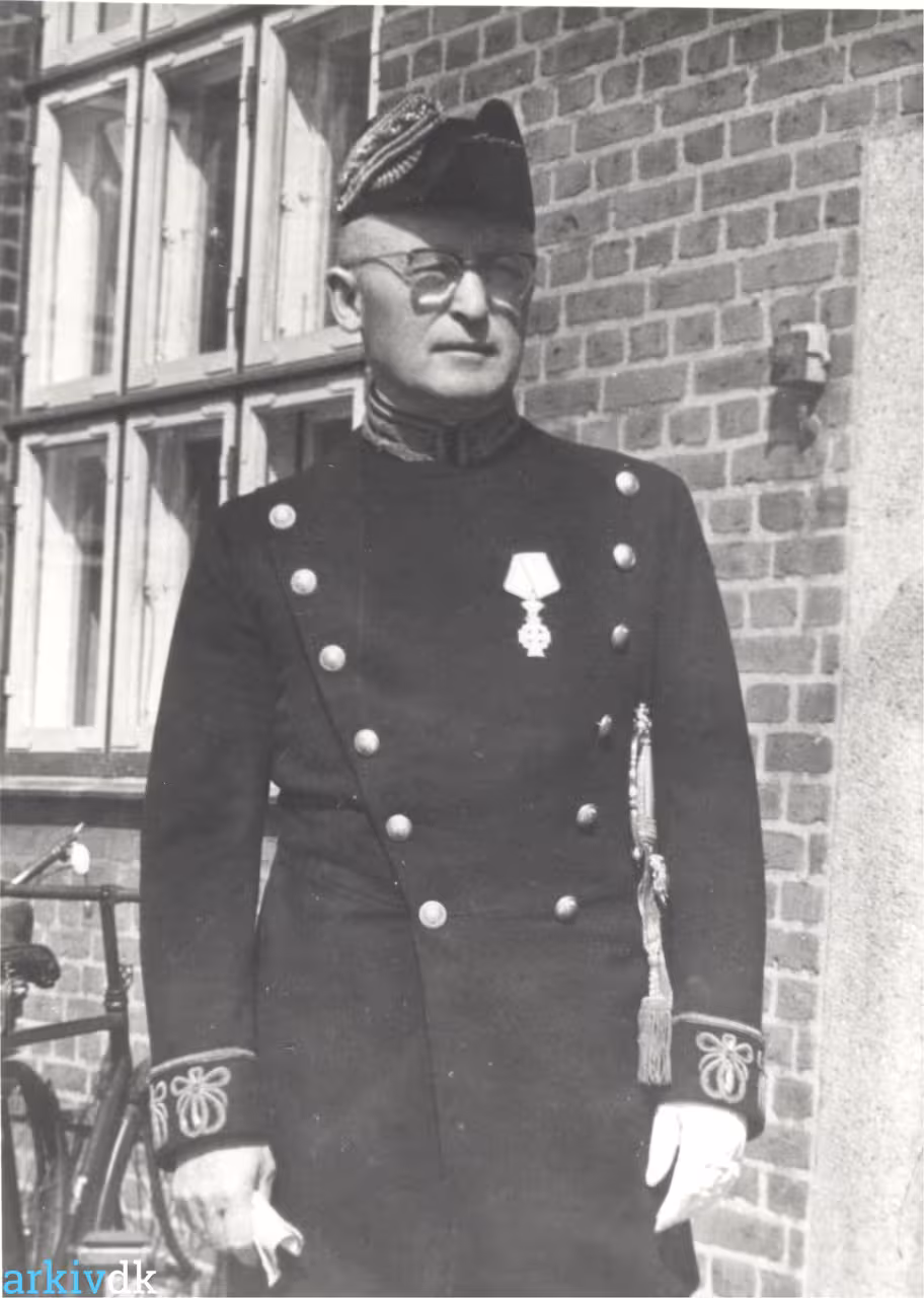Postmester A.B. Ludvigsen i galla foran Slagelse Postkontor