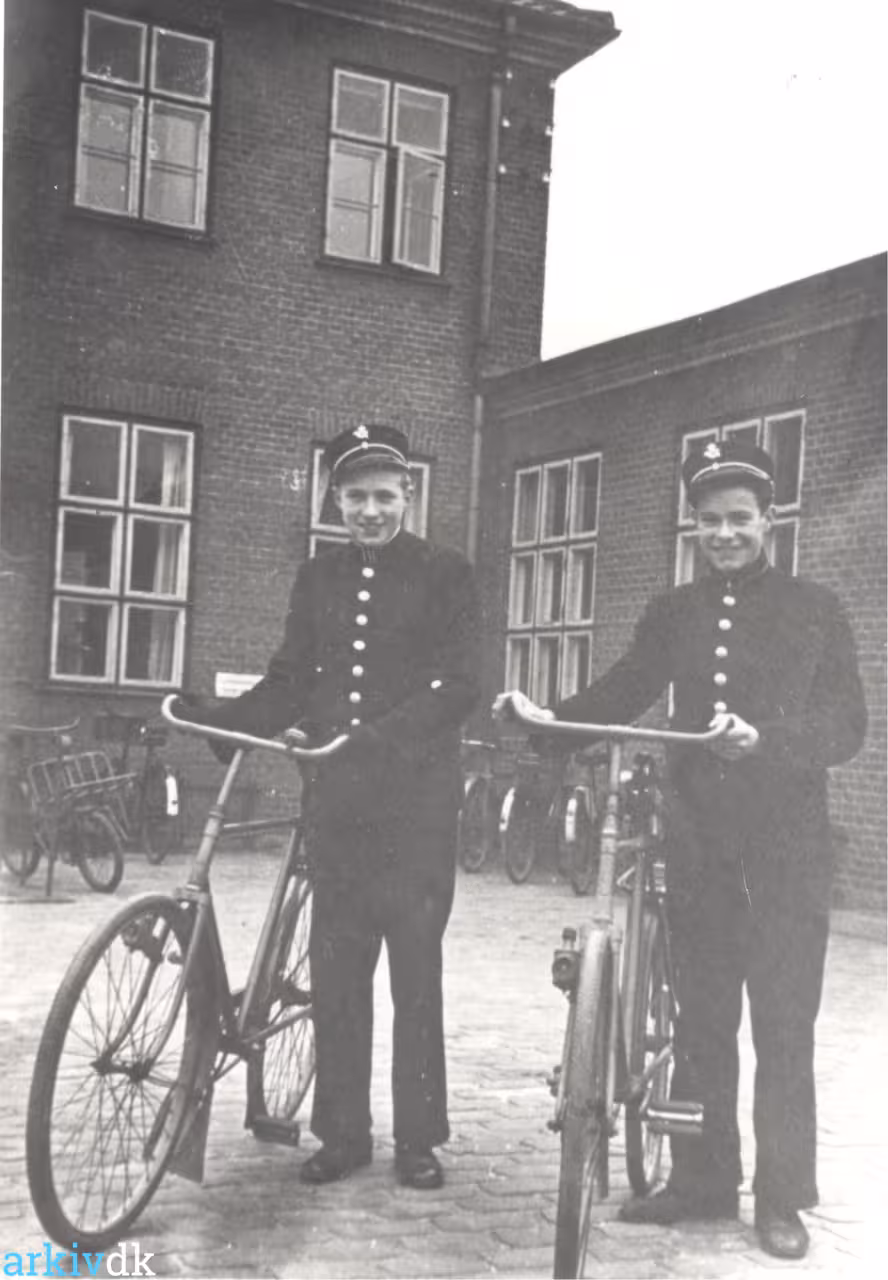 Telegrafbudene Egon Tønnesen og Kaj Christiansen i postkontorets gård