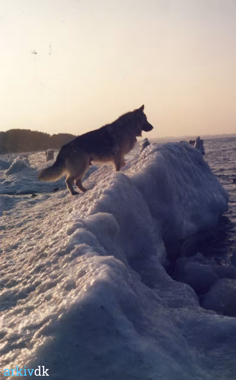 1 Vollerup/Kallerup Strande, Røsnæs Nord. Zanto betragter havet fra isskruningerne. 16/2 1986.
