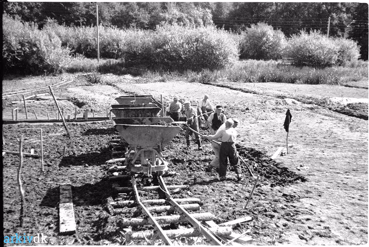 Beskrivelse Skovsøen i Fruens Bøge bliver renset op og udvidet af en flok arbejdsløse, der skovler jord op i tipvogne.