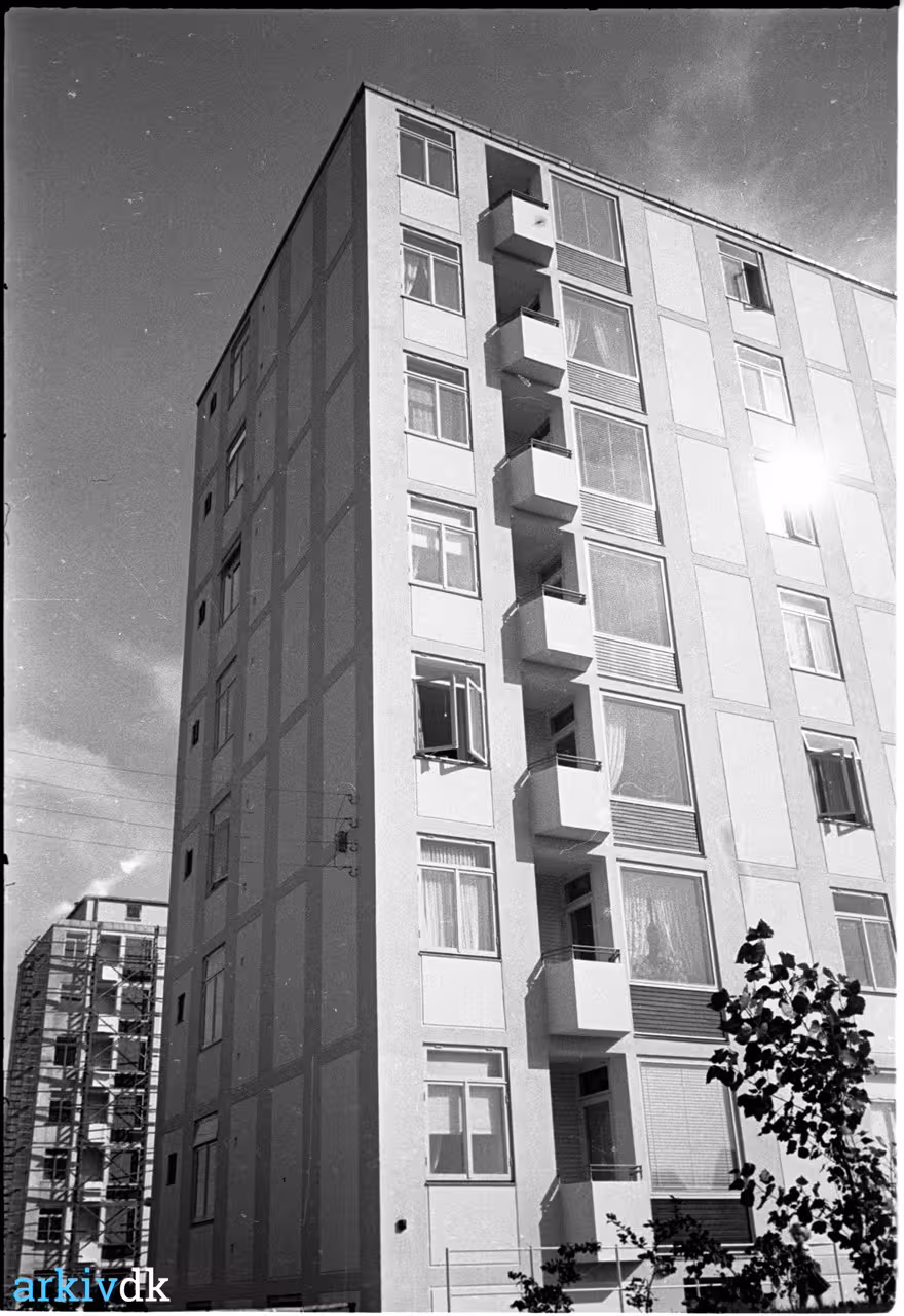 Før byggeriet af Korsløkkeparken på Nyborgvej, var de nyopførte boliger kaldet Punkthusene på Bregnevej i Tofteparken øst for Ejbygade højest i Odense. Hér ses den syv etager høje bygning fra neden og opefter.