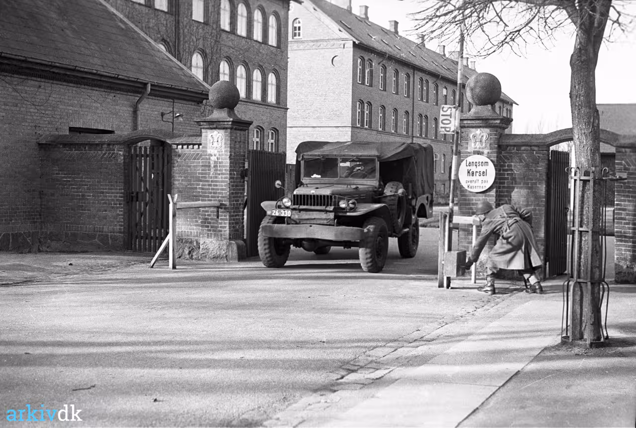Det Fynske Livregiment havde 340 års fødselsdag, og under den kolde krig var der fyldt op på kasernen på Sdr. Boulevard. Her lukker en vagt en Dodge Powerwagon ud gennem hovedvagten.