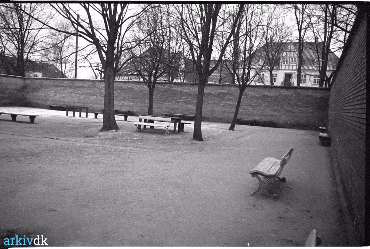 Beskrivelse Cellegården, hvor de psykiatriske patienter kunne få frisk luft. Selv i sommerhalvåret var der ikke græs i gården.