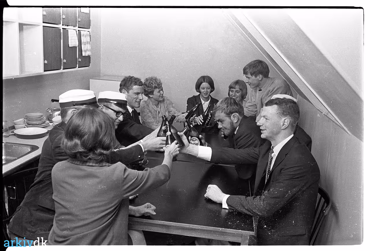 De nye studerende ved Odense Universitet skulle have et sted at bo, og 35 af dem flyttede ind på kollegiet på Langelinie til en spartansk tilværelse, hvor de blev nødt til at låne op til 30-40.000 kr. i løbet af studietiden. Her er de rykket sammen i fælleskøkkenet for at skåle på fremtiden. Nr. 4 fra v. Jørgen Axel Nielsen, 6 Pia Gade Jensen, 9 John Faber. |
