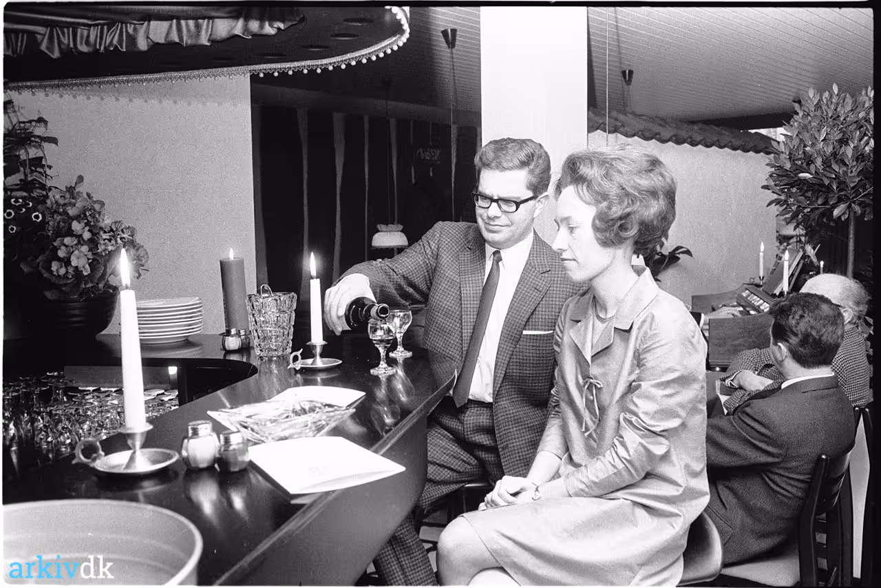 Danserestauranten Palmehaven åbnede i Gartnernes Salgsforenings tidl. lokaler ved jernbaneviadukten på Middelfartvej, bag initiativet stod regimentsmusiker Ib Dahl Hansen, der her galant skænker for sin forlovede Marianne Groth, og i baggrunden ses Kino-organisten Bent Ellegaard, der stod for underholdningen til den lyse morgen. |