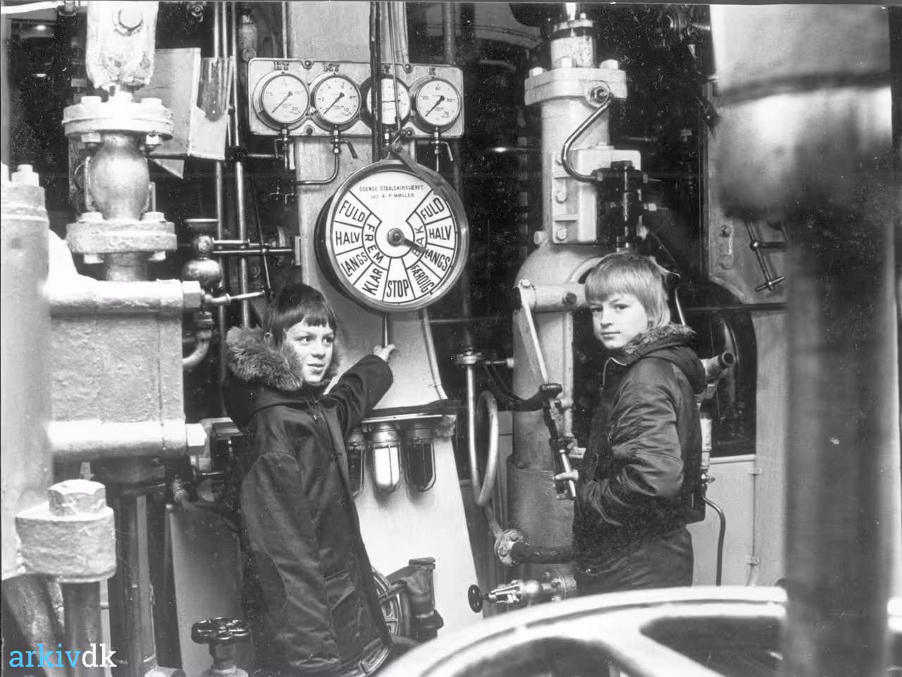 Hempel-Hansen (til venstre) er her fotograferet sammen med en kammerat ombord på isbryderen Holger Danske. De står i skibets maskinrum og besigtiger instrumenterne inden skibet