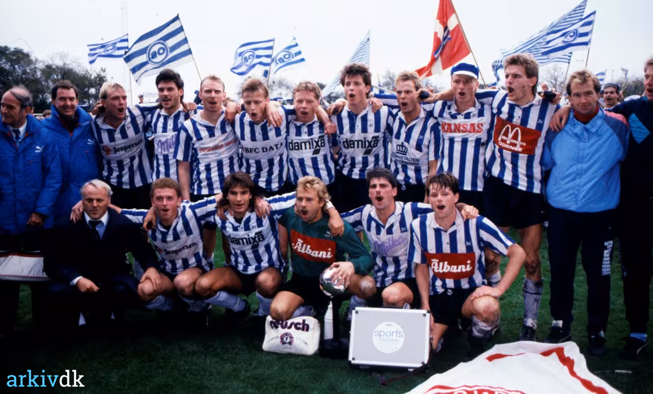 OB's danske mestre i 1989. Billedet er taget lige efter den sidste kamp i sæsonen på udebane mod Boldklubben Frem, en kamp OB vandt 1-2 på mål af Lars Jakobsen og Jan Topp Rasmussen, for Frem scorede Erik Rasmussen.