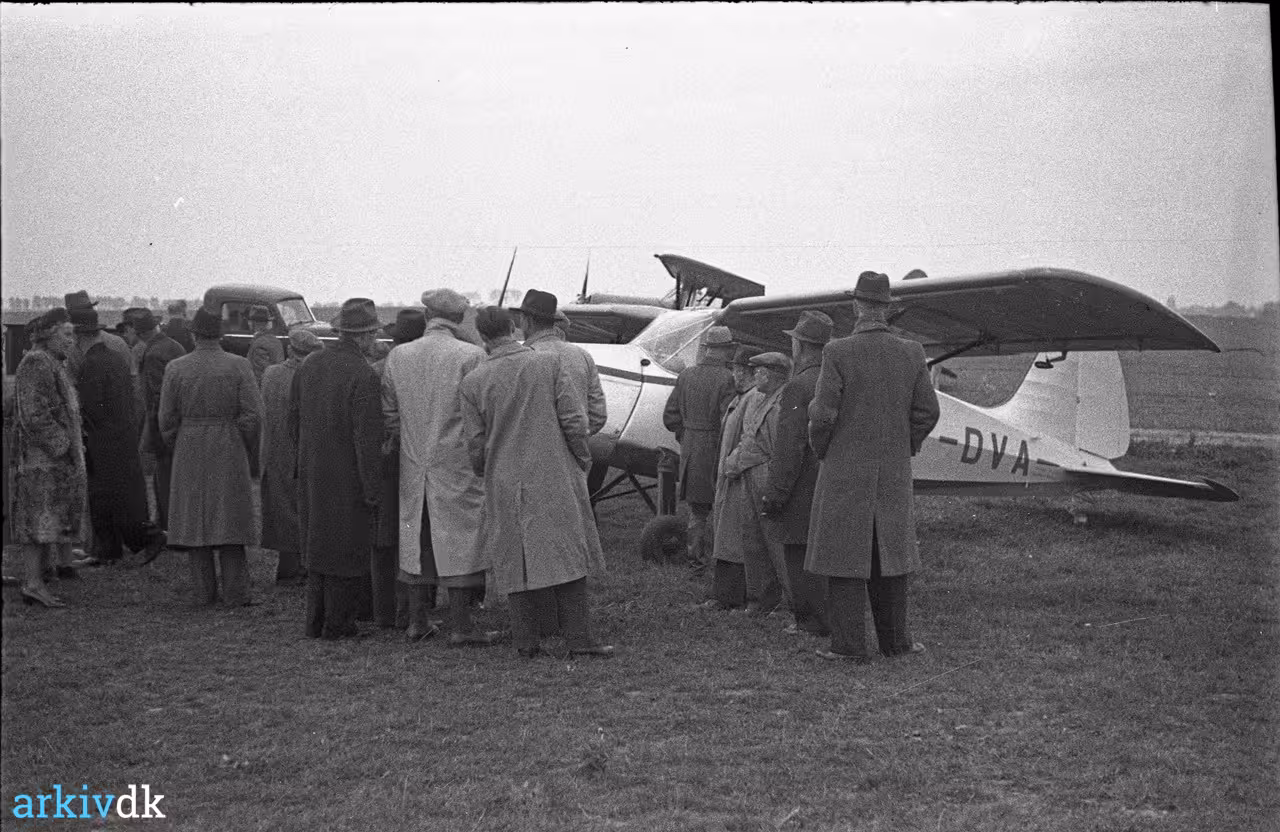 | Beskrivelse | Sidst i oktober 1947 var der demonstration i skadedyrsbekæmpelse fra flyvemaskine på godsejer Preben Daréls Ørritslevsgaards marker nær Otterup. Her ses nogle af de mange interesserede der var mødt op til demonstrationen ved flyet |