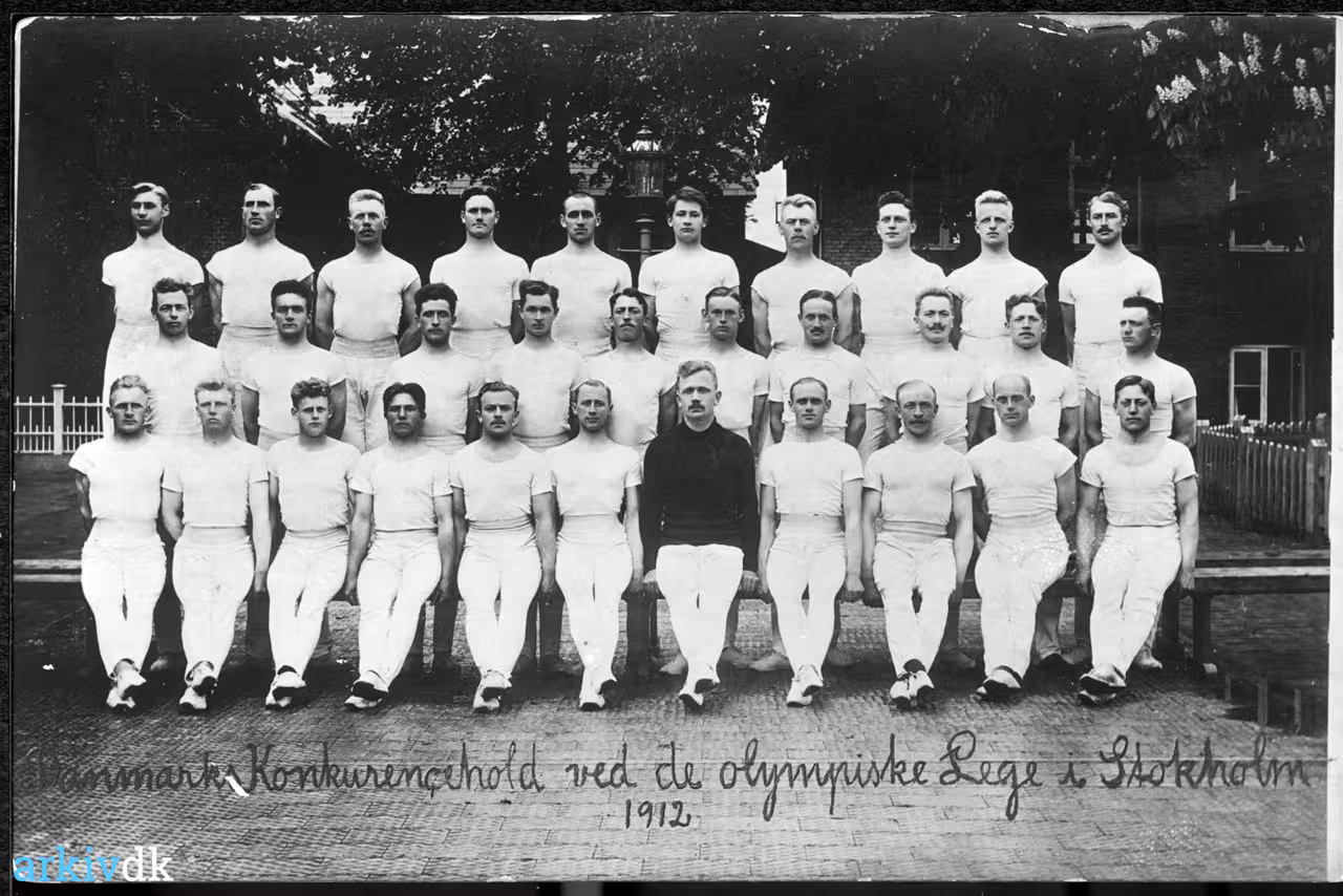 Stockholm i 1912, hvor holdet vandt sølv. Leder var den legendariske Niels Buch (i mørk trøje). Henrik Larsen, 24 år, ses som nr. 3 fra høj re i den midterste række. Se også B 101181. |