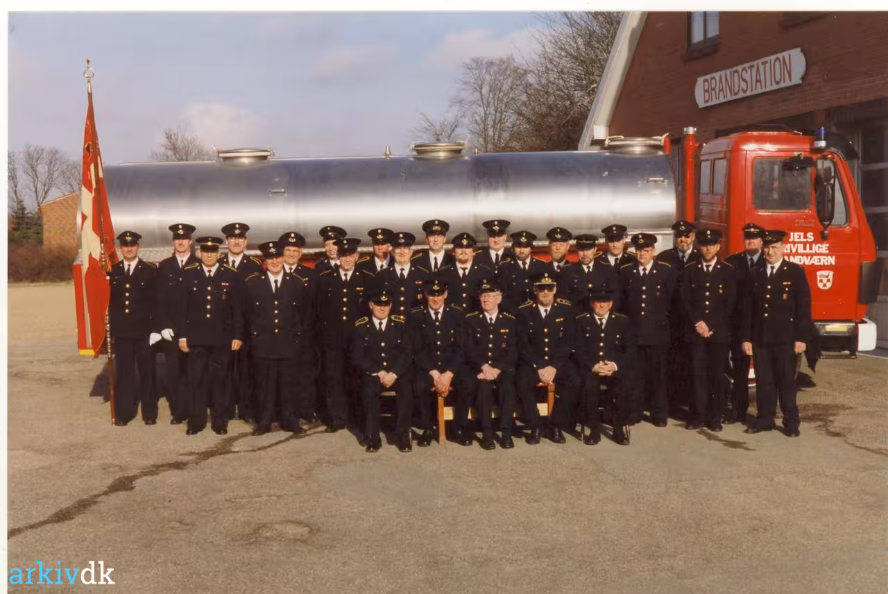 Beskrivelse Jels frivillige brandvæsens mandskab foran brandstationen