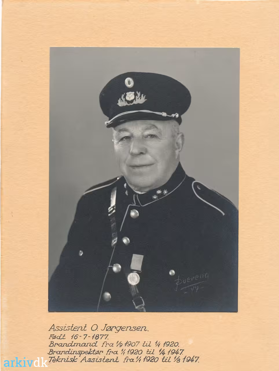Brandkorps. Assistent Oluf Jørgensen født 16/7-1877. Brandmand fra 1/9-1907 til 1/1-1920. Brandinspektør fra 1/1-1920 til 1/4-1947. Teknisk Assistent fra 1/1-1920 til 1/8-1947. |