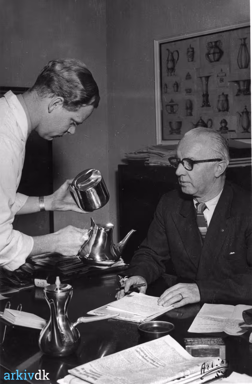 Beskrivelse Hans Bunde, sølvsmed og designer (til venstre) og Einar Ditlev Cohr, direktør. De beundrer en mokkakande af sterlingsølv med elfenbenshank.