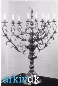 Beskrivelse 106 cm høj Chanukka-stage fremstillet til synagogen i Fredericia af gørtler Peter Grønning i 1779.