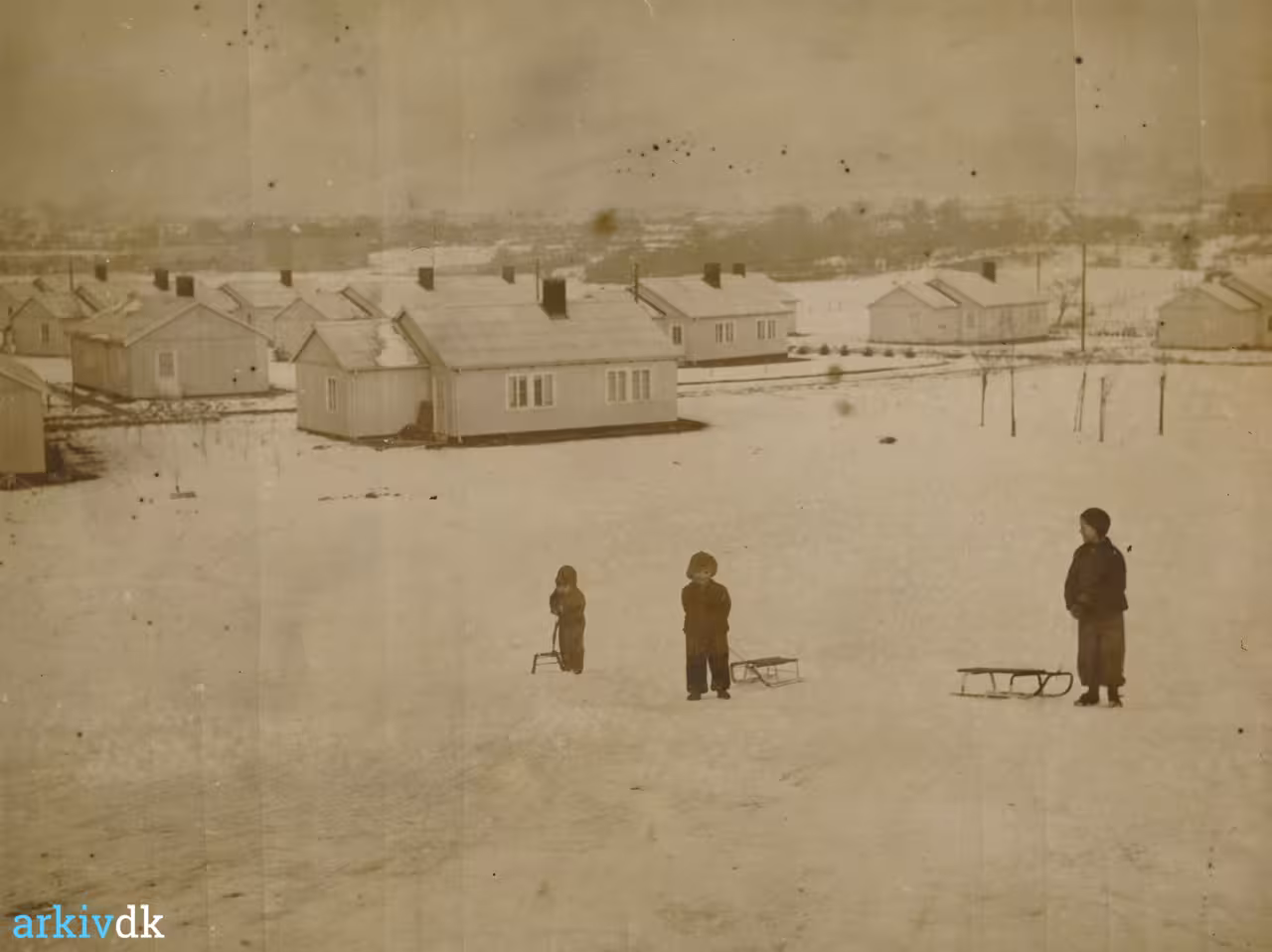 Beskrivelse Børn med kælke. Vinterbillede fra Herlevhuse