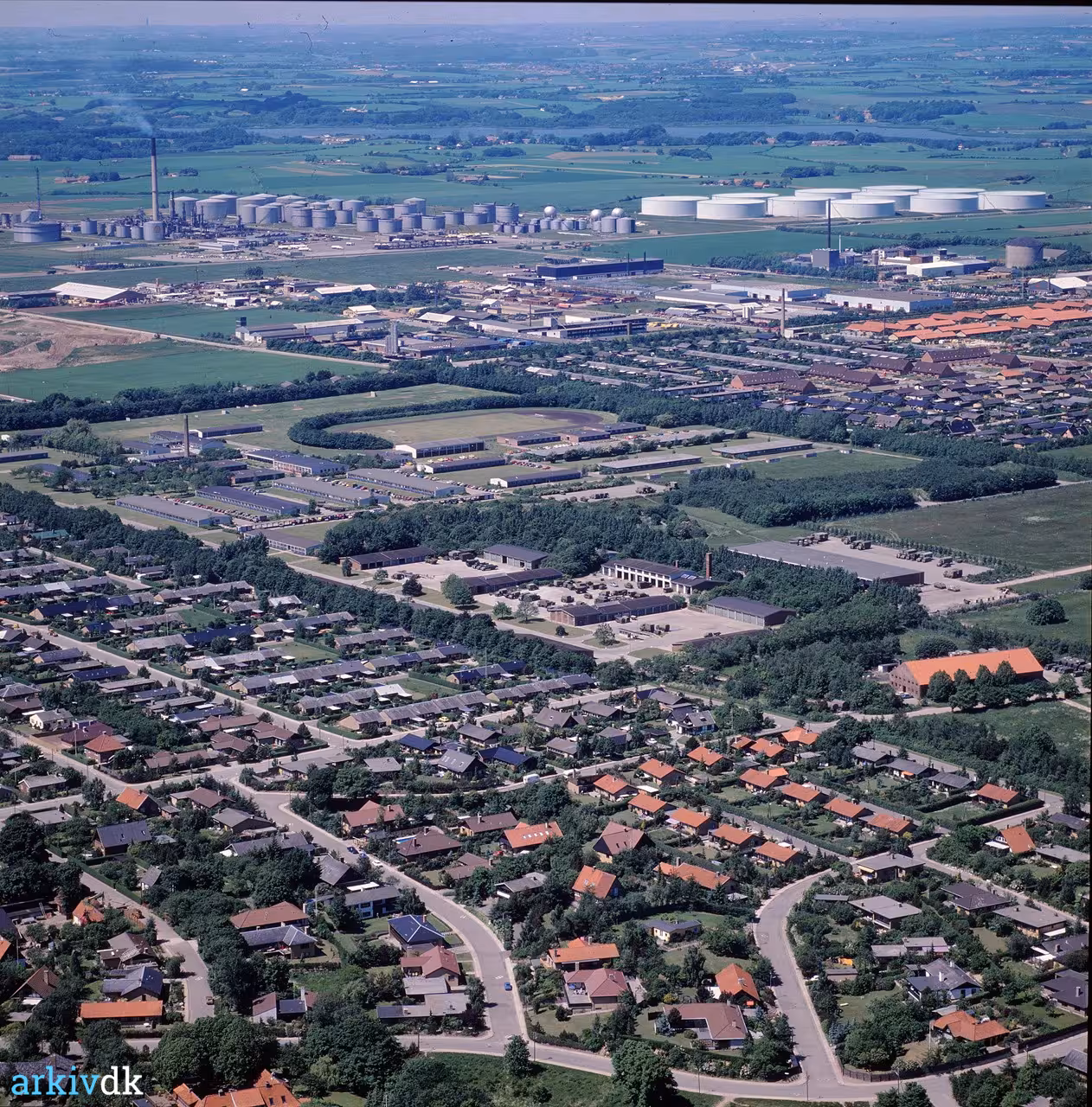 Beskrivelse Luftfoto af Ryes Kaserne set fra Fælledvej mod nordvest med bl.a. Shell Raffinaderiet i baggrunden.
