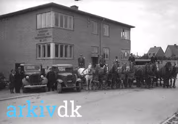 Hestevogne og biler foran vognmand Sigurd Pedersens forretning på Str. Kirkevej, Esbjerg. Fra v.: Dagmar og Sigurd Pedersen. Fra h.: Moienborg Christiansen og Ejnar