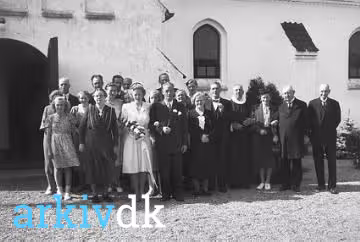 Beskrivelse Brudepar med familie og venner udenfor kirken.