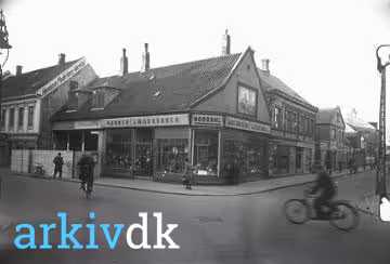 Beskrivelse Facadefoto af læder-, legetøjs- og galanterihandler Nordahks forretning i Kongensgade 67.