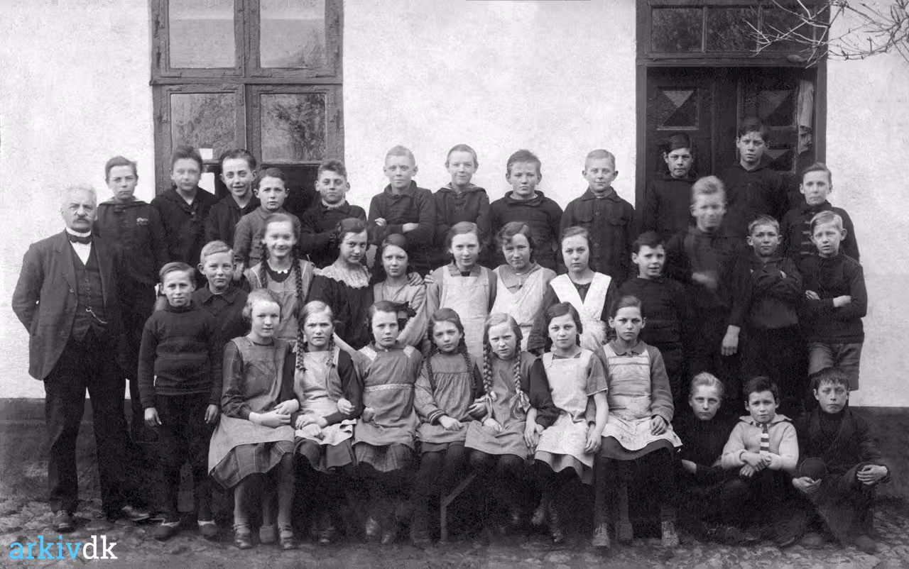 Foran indgangen til skolestuen, Kirkevej 6.