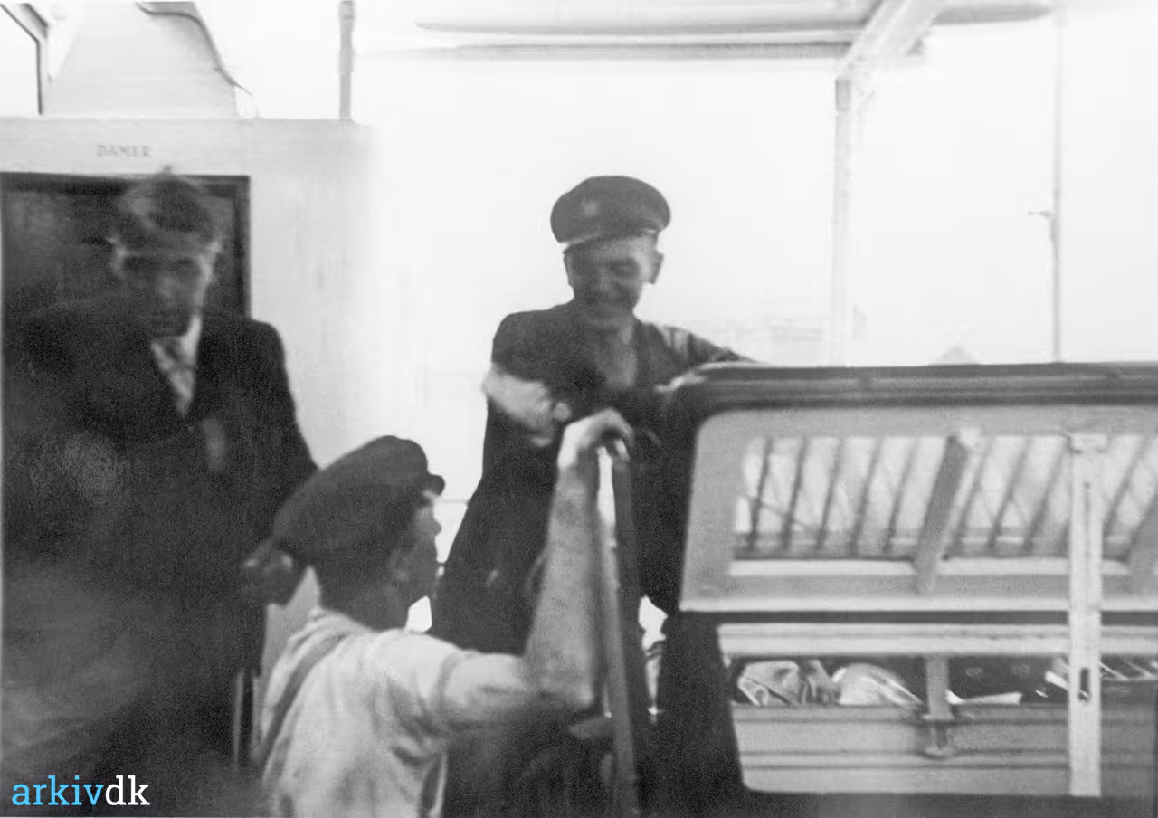 Beskrivelse Prøvesejlads. Mandskabet i snak ombord.