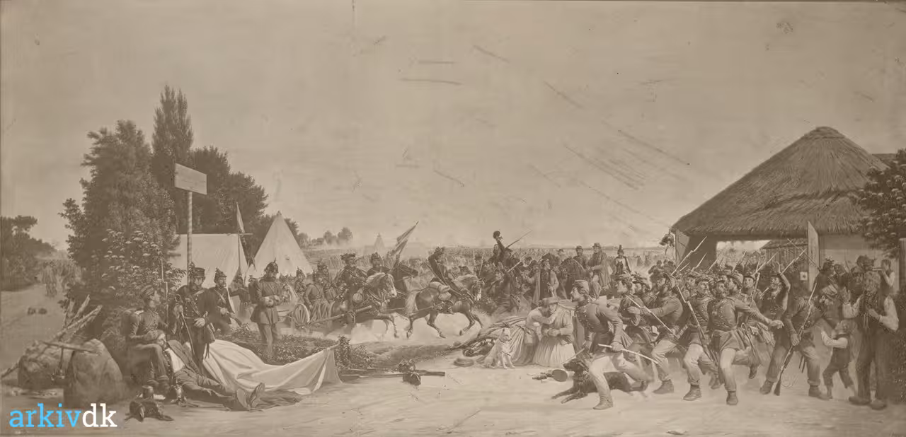 | Beskrivelse | Affotografering af maleri af J.V. Sonne: I højre side af billedet trænger danske tropper frem gennem ladeport, i baggrunden mødes danske tropper, til venstre ses tilfangetagne og sårede slesvig-holstenere. Billedet er fuld af detaljer eks. ses yderst til venstre en landsoldat hilse på en dreng, midt i billedet omfavner en ung kvinde en ældre dame ved deres side en hvid hund, til venstre aflevere en slesvig-holstener sin sabel til en dansk soldat. |