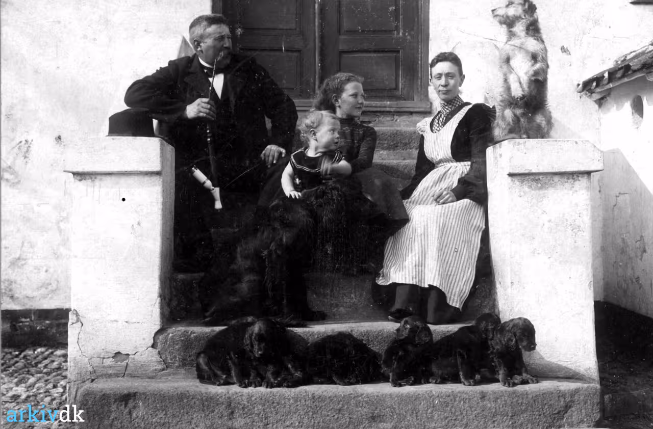 Lykkens Gave. Hans Peter Olsen og hustru Johanne Marie, samt 2 børn og hunde, sidden på hovedtrappen til gården Lykkens Gave.
