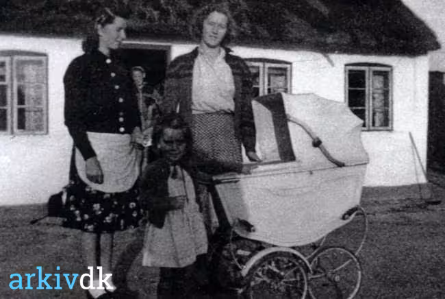 Marie Petersen (f. Kendra) og Sofia Kendra fotograferet med barnevognen foran Krogsbakkevej 9 i Kelstrup. Ved siden af barnevognen Maries datter Kirsten. I barnevognen ligger en anden datter Birte. Familien Petersen boede i 1940'erne i Kelstrup. |