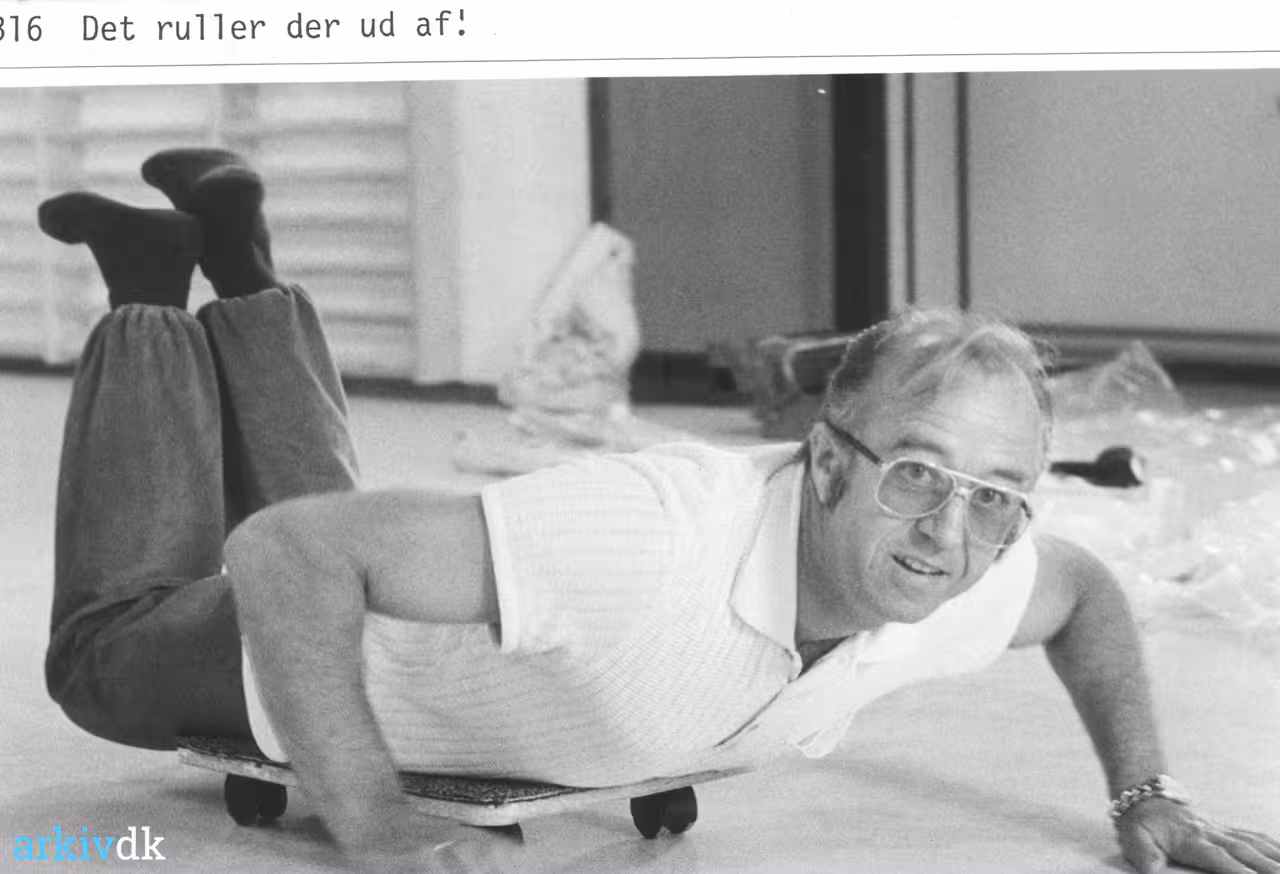 Beskrivelse Eigil Kristensen, Thommysminde Centret, afprøver et af sine redskaber før åbningen af centret (fysioterapi), Hvejselvej 63, Hvejsel.