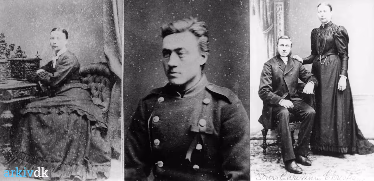 Ungdomsbilleder af Kristiane og Søren Christensen i deres fine tøj og Søren i militæruniform
