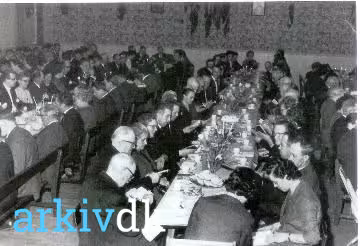 Beskrivelse Afskedsfest i Lomborg Forsamlingshus for pastor Martin Møller Madsen, marts 1965