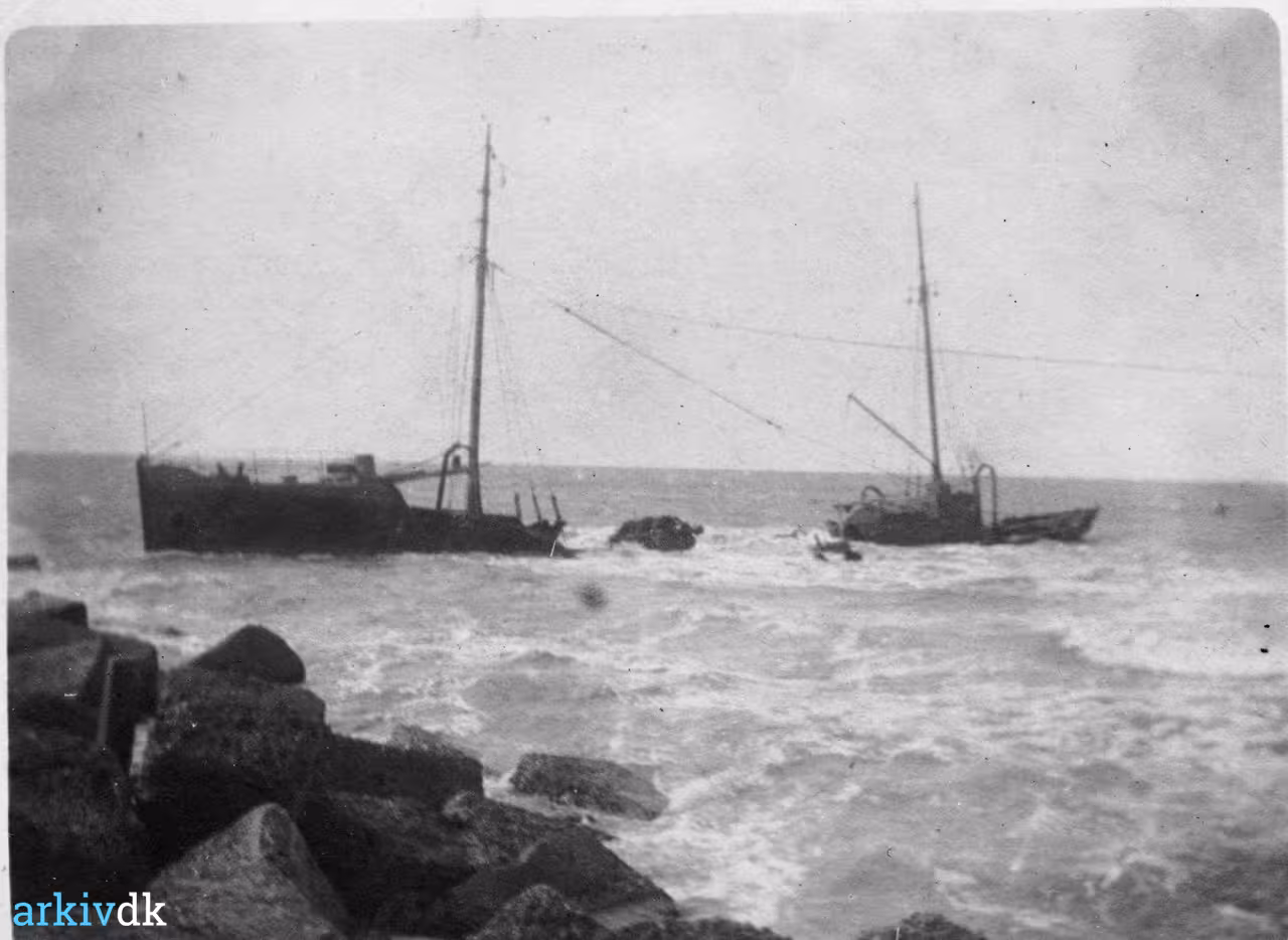 Strandet ved Knopper, Harboøre. En Trawler ”Brocheswalde”, hjemsted Cuxhaven, Tyskland. Lastet med 40 tons fisk. Strandet i Chr. Knoppers strandlen. Skibet var på vej fra fiskepladsen i Nordsøen til Cuxhaven i Tyskland. Besætningen på 12 mand blev reddet af raketapparat fra Thyborøn redningsstation.