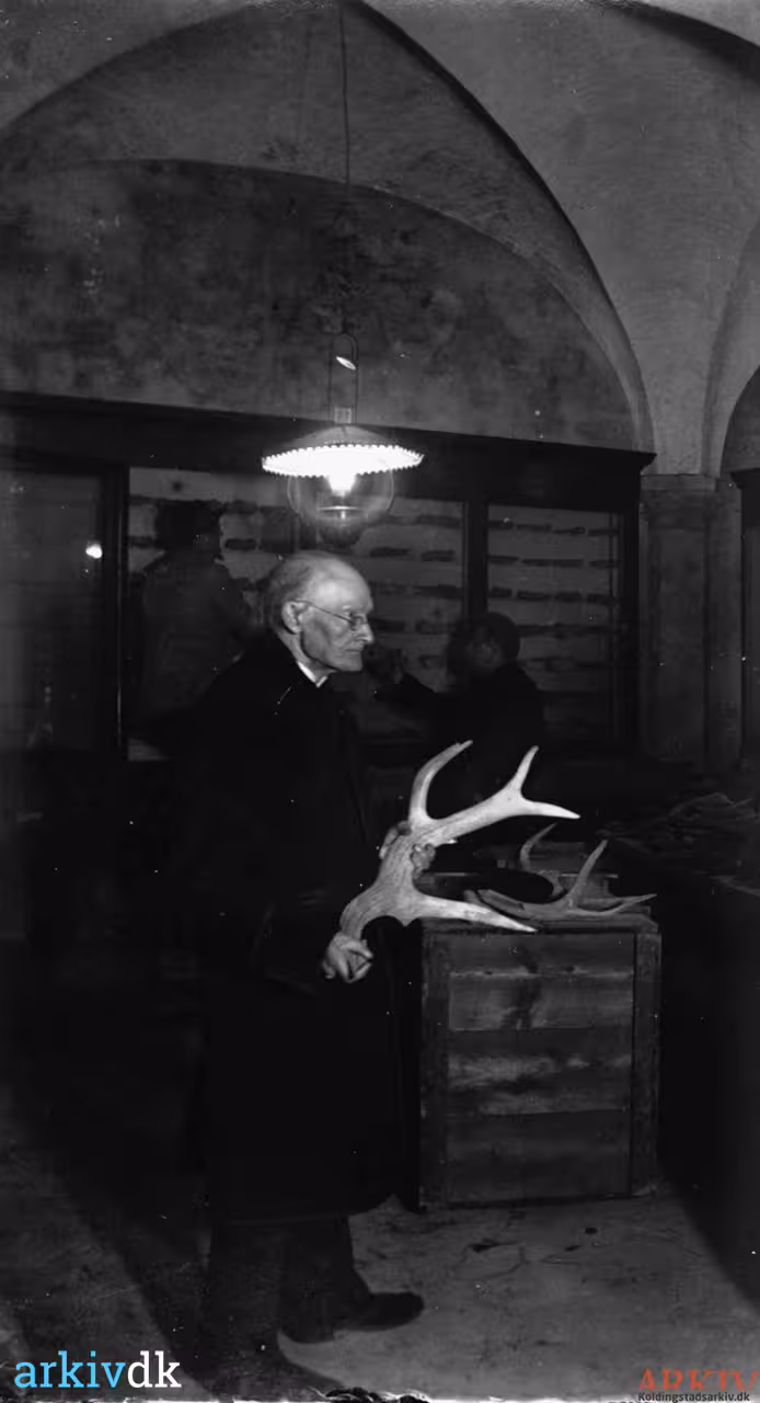 Skomagermester P. Martin Møller hjælper til med udstillingen. Skomagermesteren hedder enten Peter eller Poul til fornavn. Billedet er brugt i Brandorffs bog " Kolding I Oldtiden" |