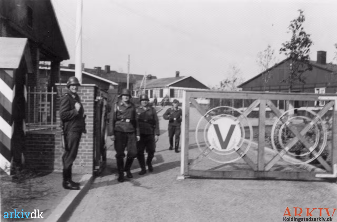 Kolding. Besættelsen. Vagt ved indgangen til Dyrehavelejren på Dyrehavevej 108 (Dyrehaveskolen). Soldater er på vej igennem porten. Lejren var bl.a. bygget til Luftwaffe.