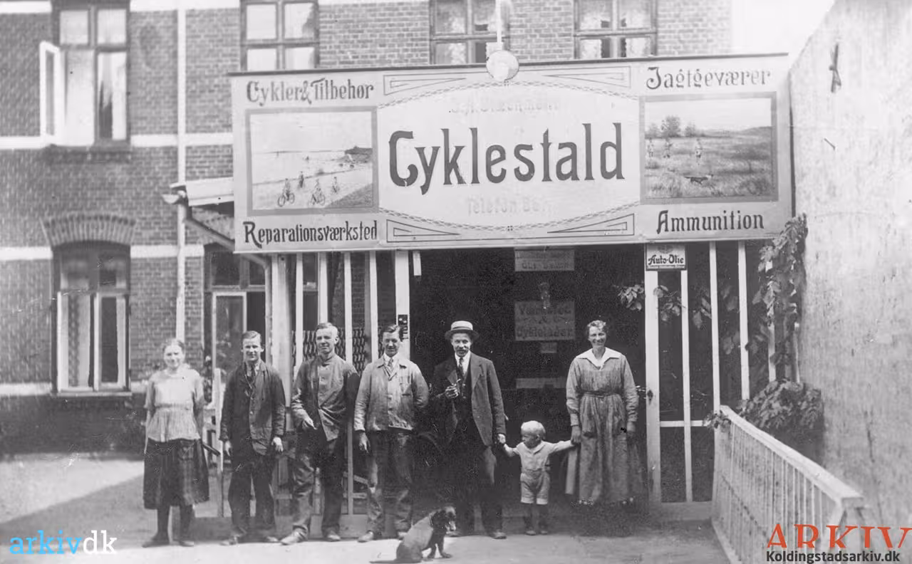 Kolding. C. A. Stæchmanns Cykelforretning. Fra venstre Tine husalf sandsynlighed Katrine Dinesen, Cykelhandler Andresen, fætteren Jørgen Nielsen, Peter Ahn Eriksen, Carl A. Stæchmann, sønnen Kjeld Stæchmann, og Dothea Stæchmann. Forrest i billedet ses en gravhund. |