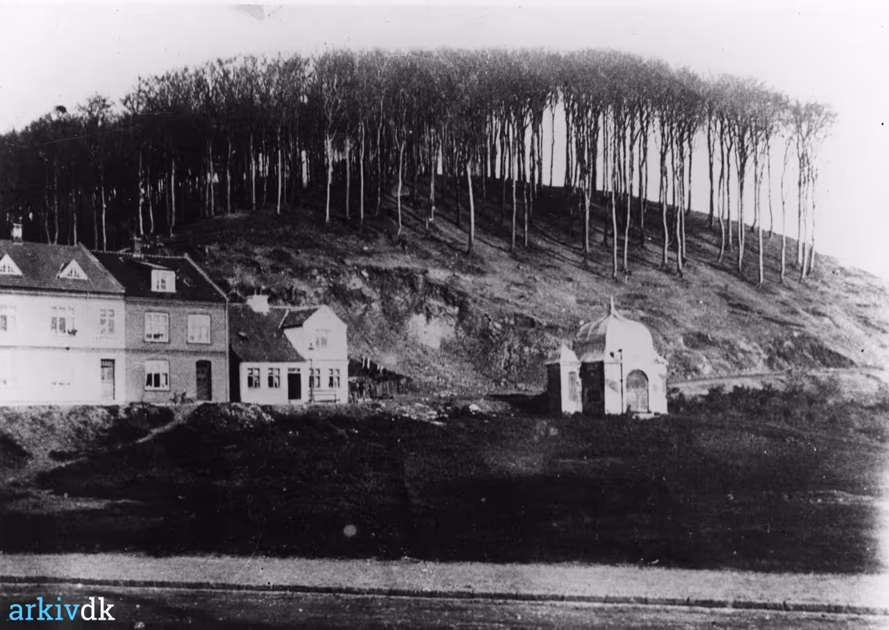 | Beskrivelse | Med det såkaldte Kapellet eller Gartner Nielsens Minde, hvor der om sommeren blev serveret friske jordbær med fløde. I baggrunden Pilkebakken.