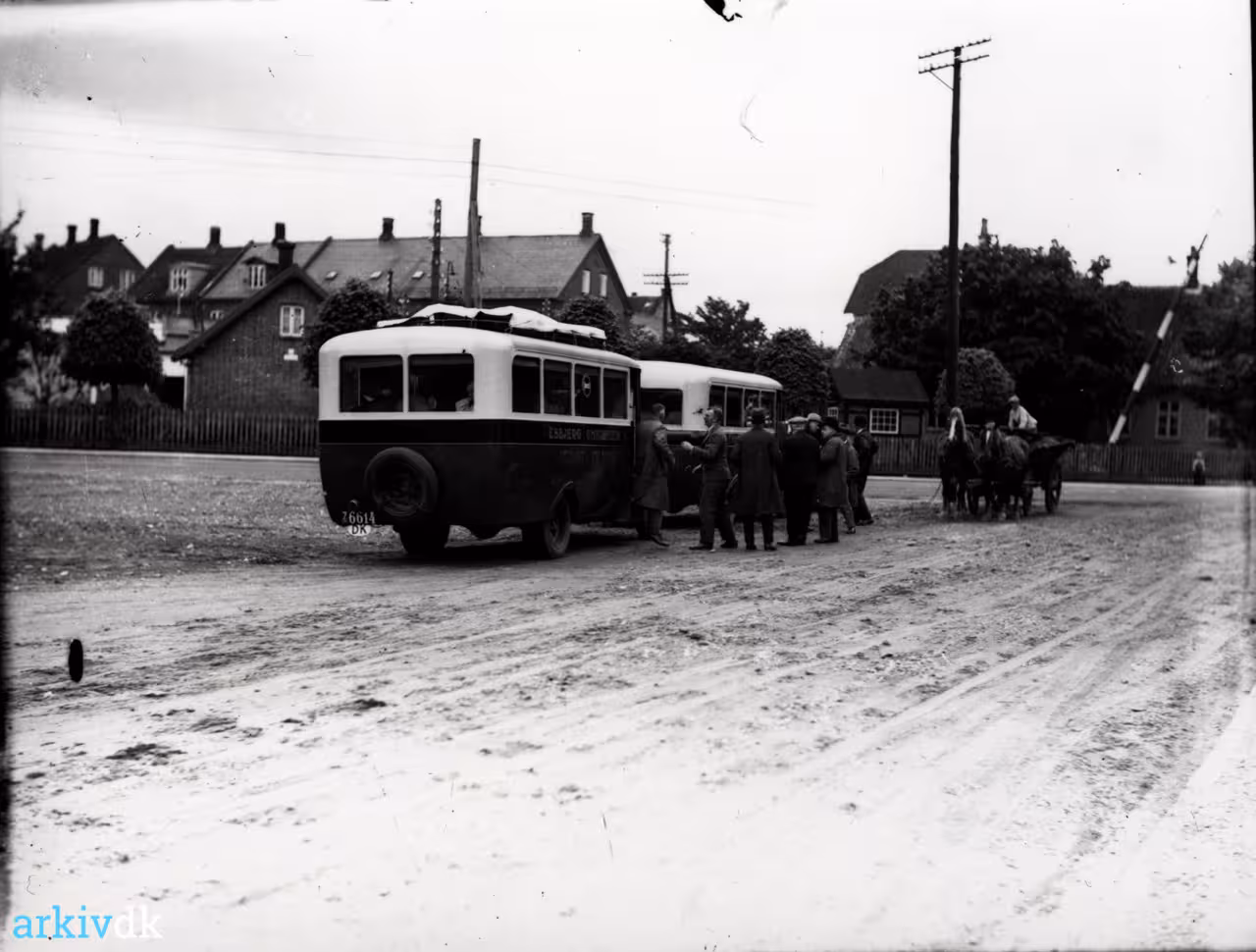 To rutebiler på en gade, der er også en hestevogn. Det er ikke langt fra en baneoverskæring. Der står nogle mænd ude på gaden. På rutebilen står der Esbjerg Omnibiler Turist Trafik.