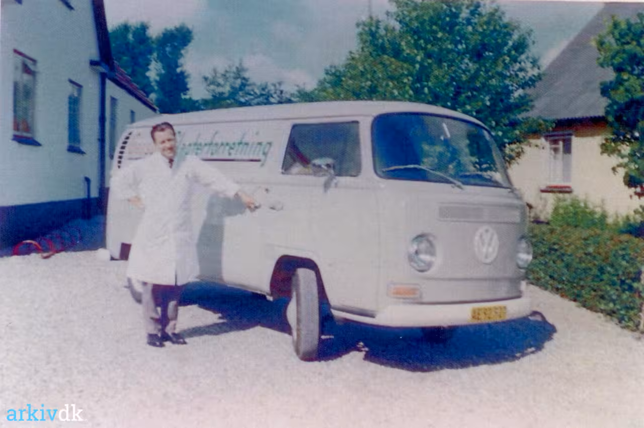 Gassum Slagterforretning. 2 billeder af Egon Didriksens slagterbutik, som er indrettet i et "folkevognsrugbrød" WV-transporter, så han kan køre rundt til kunderne. Det ene billede viser hylderne inde i bilen, hvor kød og pålæg m.m. ligger i et kølerum med fliser. Det andet billede viser Egon Didriksen i hvid kittel uden for bilen, som har påskriften: Gassum Slagterforretning.