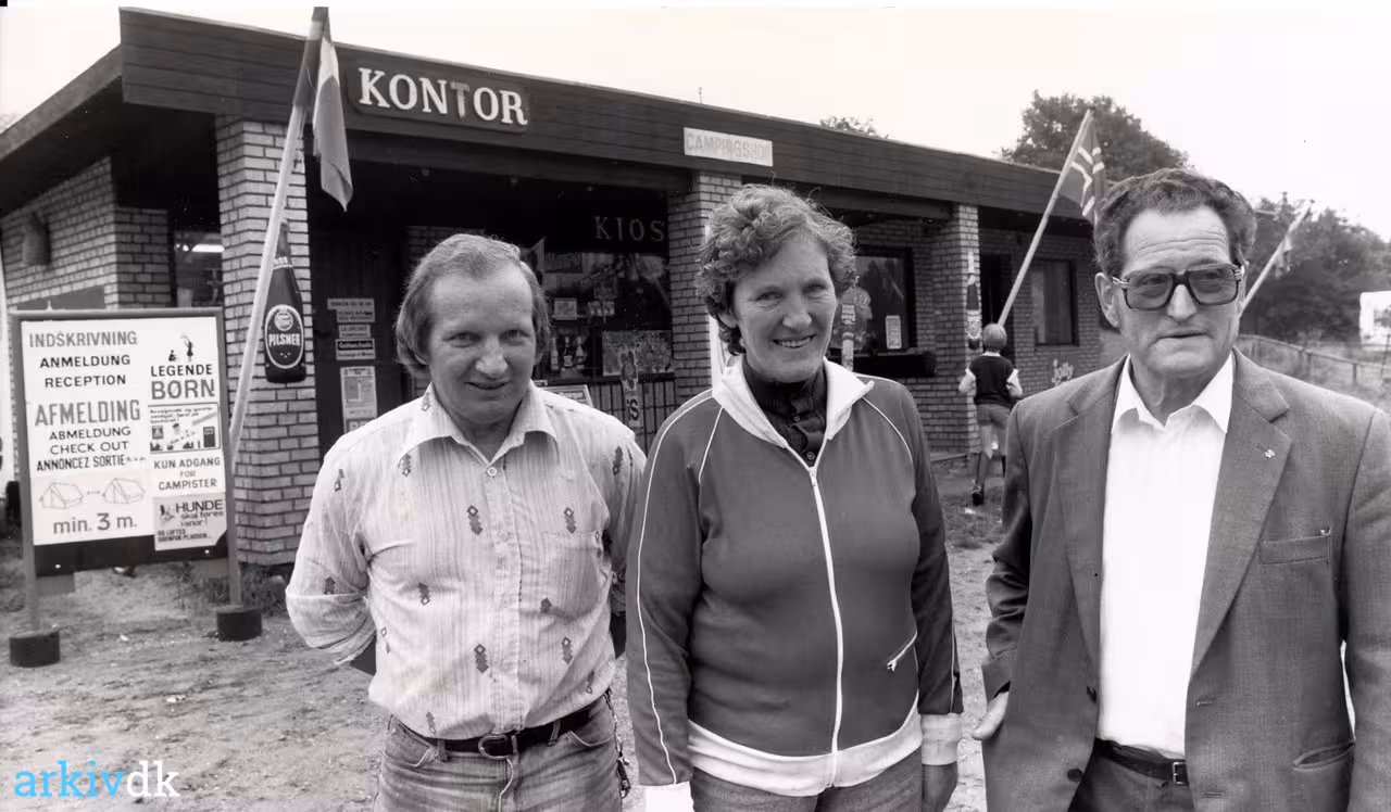 25 års jubilæum. Auning Camping, 29-6-1985. Fra v. ses Ib og Gerda Mikkelsen og Knud S. Poulsen
