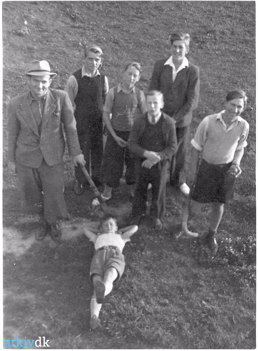 Fra venstre: Leif Hansen, Aage Larsen, Helmer Andersen, Poul Jacobsen, Jørgen Hansen og Henning Jensen. Liggende Leif Hansens nevø Per |