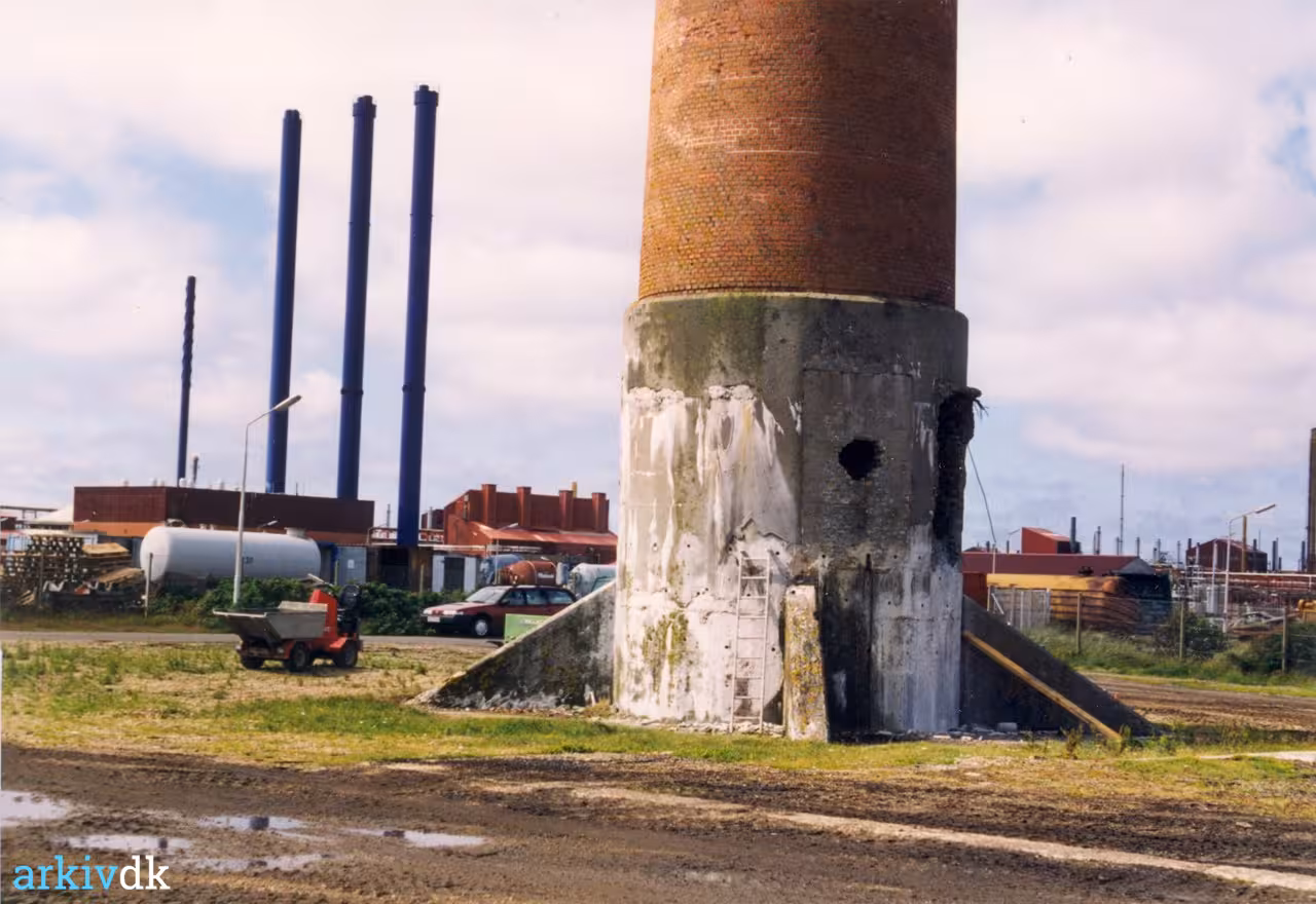 Beskrivelse Sprængning af skorsten på Cheminova, 1998. Gør klar til at bore huller, til spræning.