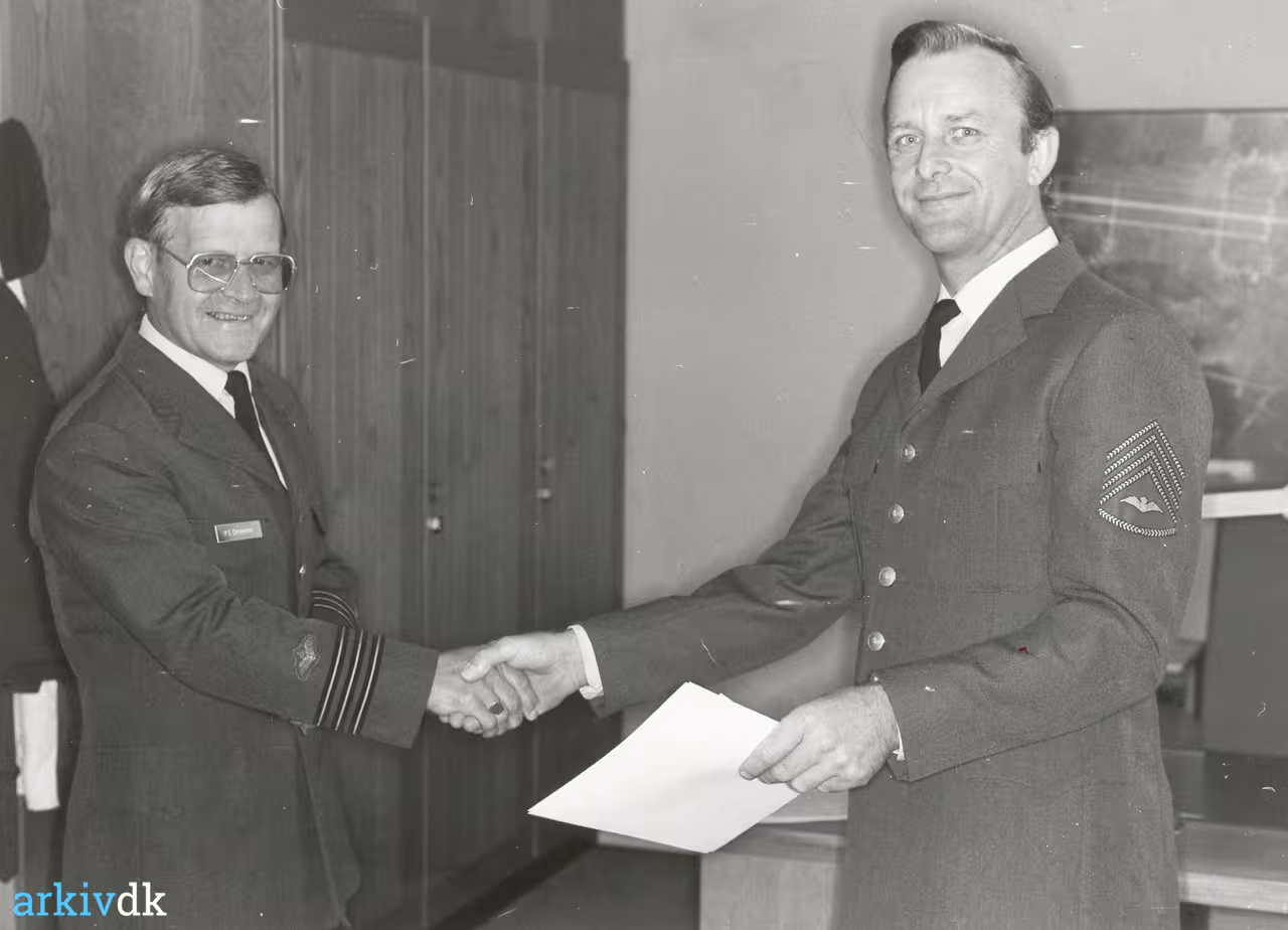 | Beskrivelse | Flyvestation Vandel. Oversergent Birger Thomsen holder 25 års jubilæum på Flyvestation Vandel og får overrakt sin medalje af Major P.E. Christensen. Datering: 1988. Fotograf: VAF. Foto fra venstre P.E. Christensen |