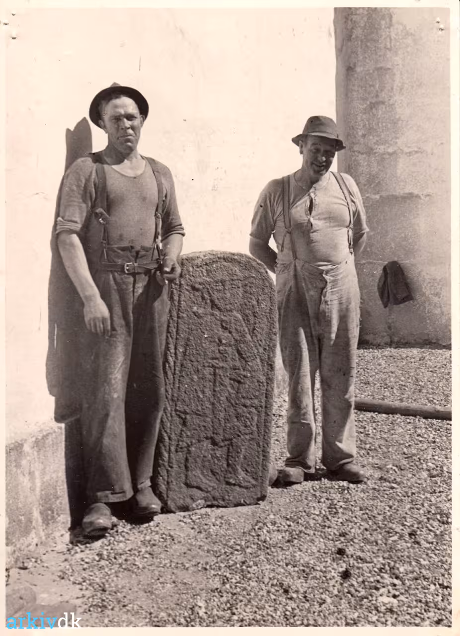 | Beskrivelse | Viggo Hougaard, hjælper graveren, Kristian Laursen, med en mindesten på Nørager kirkegård. Kristian Laursen
