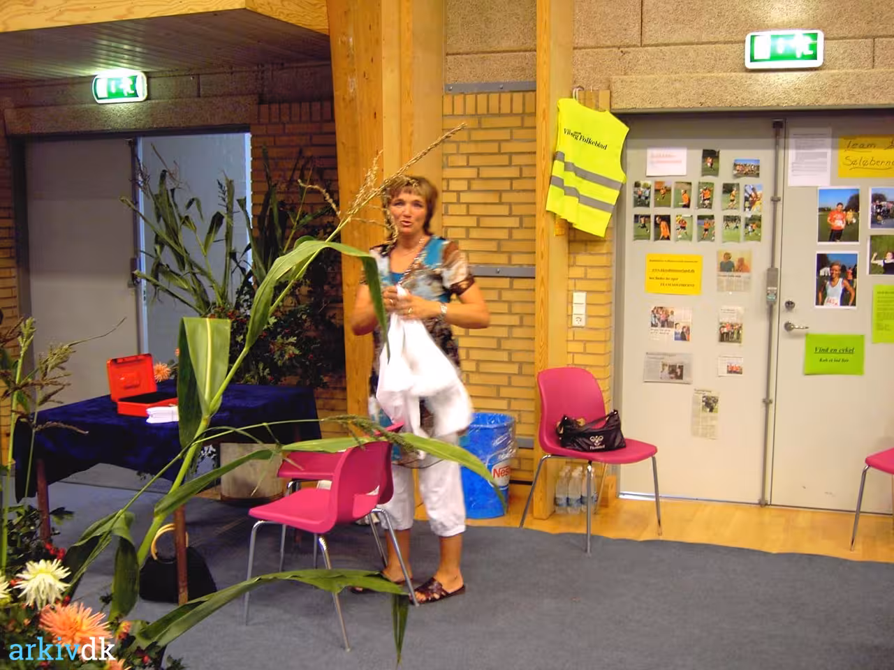 Beskrivelse Hanne Lange Nielsen sidder ved indgangen og sælger billetter til sundhedsmessen i Klejtrup Hallen