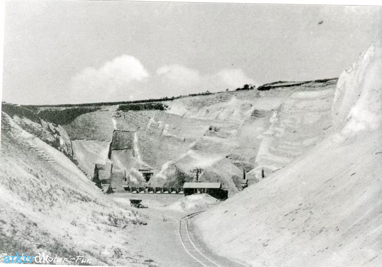 | Beskrivelse | I molergraven på Færkerhede ses arbejdsskuret, samt tipvognene. Midt i billedet ses trapperne i skrænten, en system arbejdet foregik på. |