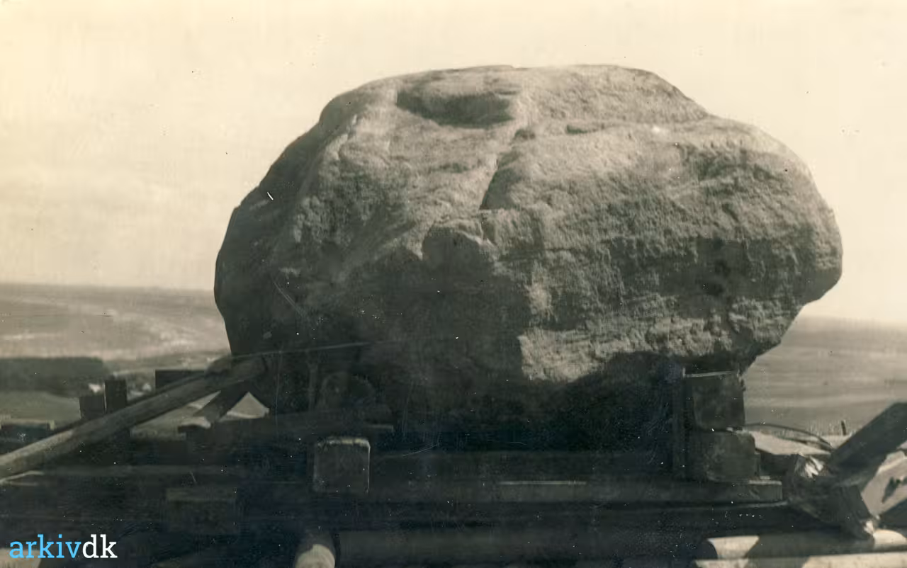 | Beskrivelse | "Troldstenen" på blokvogn på toppen af Esterhøj efter transporten fra Høve Strand.