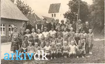 Lærer Rudolf Bak Olesen og lærer Anna Christensen med eleverne foran skolen. I baggrunden Grønning kirke |