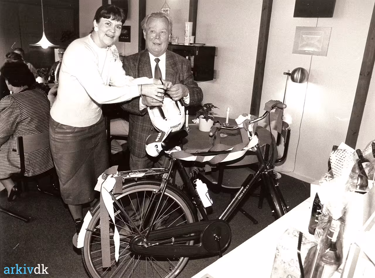| Beskrivelse | Borgmester Linda Egaa og kommunaldirektør Bent Winge Hansen ved festlighed med gaveoverrækkelse, 1990.