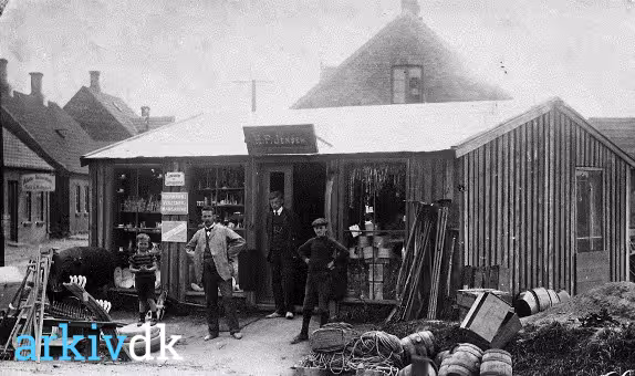1. Karl Jensen, søn af nr. 2 2. Købmand Hans Peter Jensen 3. Kommis 4. Hans Peter Jensen, søn af nr. 2 I 1914 under byggeriet af den nye forretning på Bystedvej 2, havde H.P. Jensen lavet midlertidig forretning på hjørnet overfor på Toustrupvej 2. Bemærk varerne udenfor. De blev ude om natten. Familien flyttede fra Durup til Vejle 29.02.1929 |