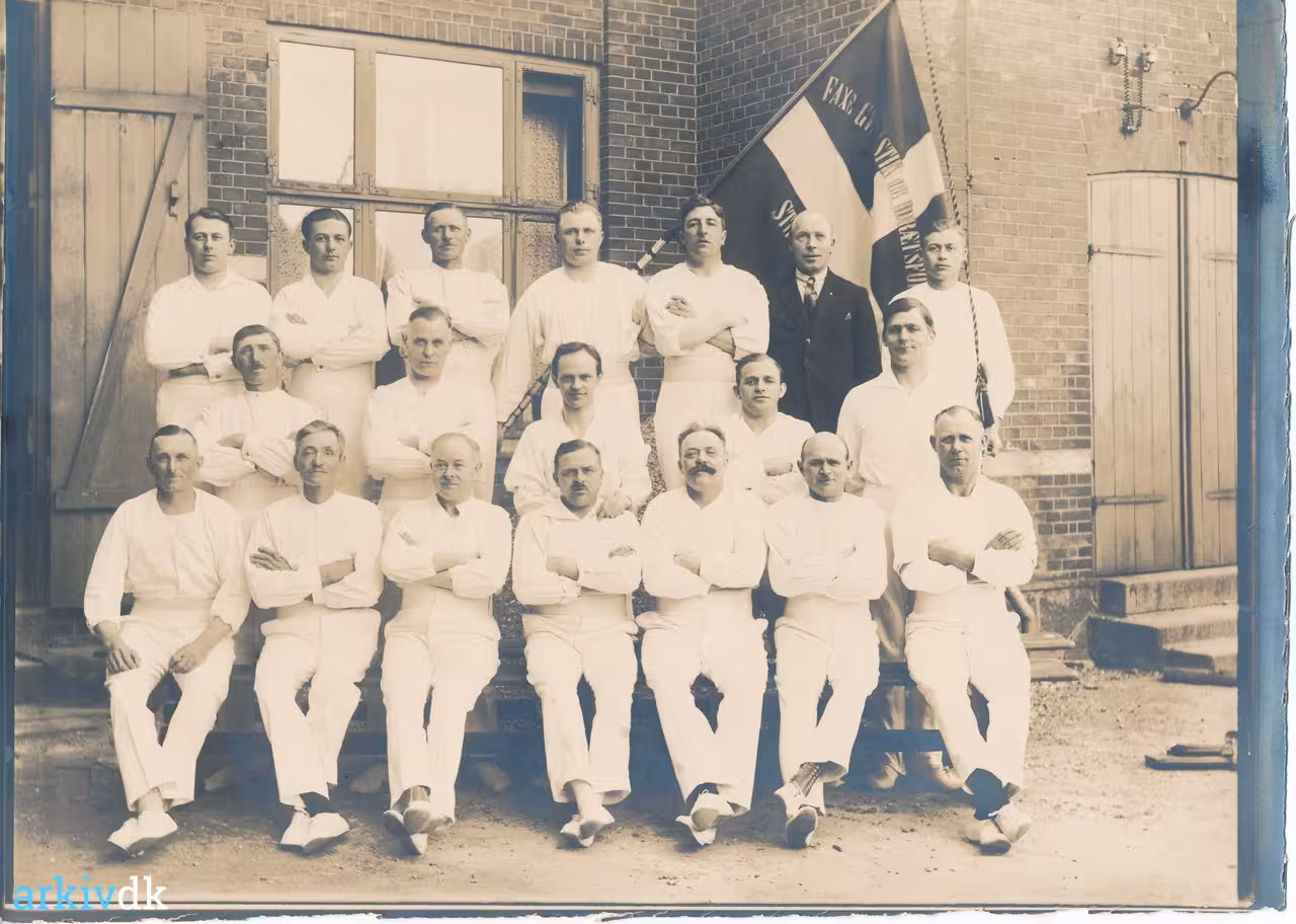 Bagerste række nr. 1 fra venstre: Urmager Otto S. Olsen, Kirketorvet. Nr.5 fra v. Rebslager Sofus Zachariasen, Nørregade 4, over for bryggeriet, 1. Mand fra højre, bagerst. Skrædder Jørgensen, Egedevej.